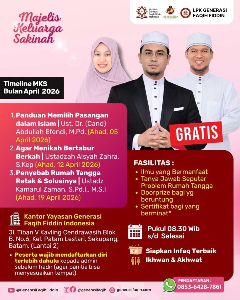 Majelis Keluarga Sakinah menghadirkan pembahasan mendalam seputar tema pernikahan, parenting, dan pendidikan anak secara sistematis. Seluruh kegiatan diselenggarakan secara GRATIS untuk masyarakat umum sebagai komitmen, khususnya calon pasangan, pasangan muda, maupun suami istri.
