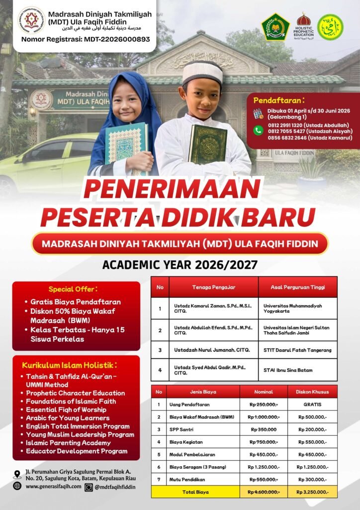 Madrasah Diniyah Takmiliyah (MDT) Ula FAQIH FIDDIN hadir sebagai lembaga pendidikan Islam yang berfokus pada pembinaan pemahaman agama yang mendalam (tafaqquh fiddin) sekaligus menumbuhkan karakter, adab, dan kecakapan hidup anak sejak usia sekolah dasar. MDT ini diharapkan menjadi tempat tumbuhnya generasi yang shalih, cerdas, beradab, dan siap menghadapi perubahan zaman tanpa kehilangan identitas keislamannya.