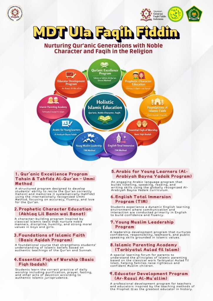 Madrasah Diniyah Taklimiyah (MDT) Ula FAQIH FIDDIN merupakan ikhtiar untuk menghadirkan pendidikan Islam yang menguatkan iman, membentuk akhlak, serta menyiapkan generasi yang siap menghadapi masa depan dengan nilai-nilai Islam.