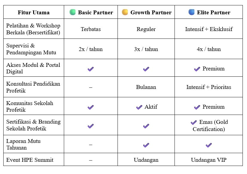 - Elite Partner โ Menjadi model sekolah profetik rujukan nasional, dengan branding eksklusif.